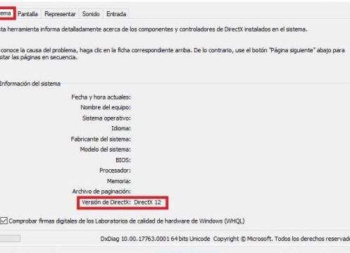 3. Aparecerá una ventana con información sobre tu sistema. Dirígete a la pestaña «Sistema» y encontrarás la versión de DirectX instalada en tu PC.